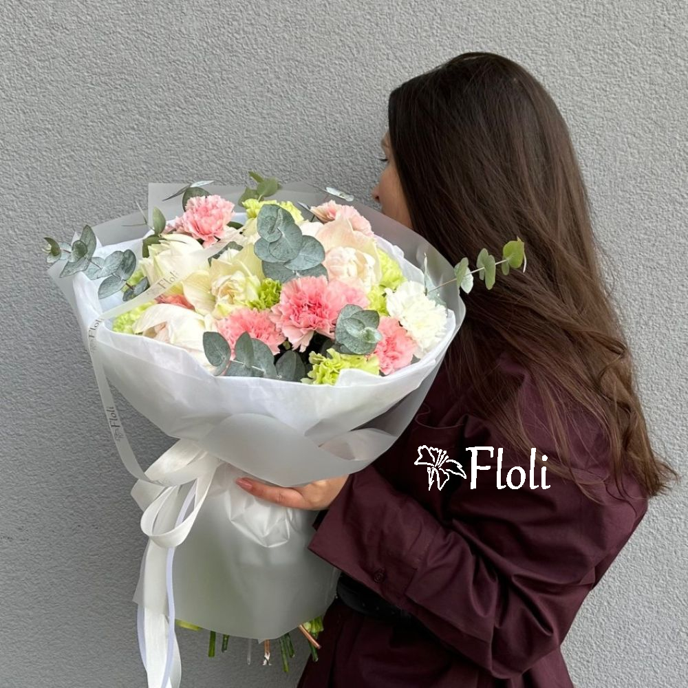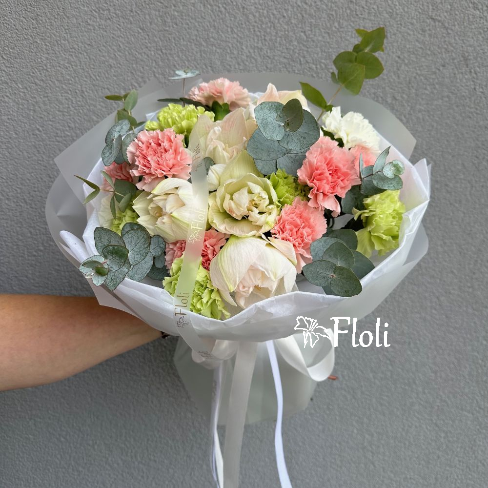 Ten wyjątkowy bukiet to połączenie białego amarylisa, różowych i pistacjowych goździków oraz świeżego eukaliptusa. Delikatna kolorystyka nadaje kompozycji lekkości i wyrafinowanego charakteru, tworząc harmonijną całość, która zachwyca elegancją i świeżością.
