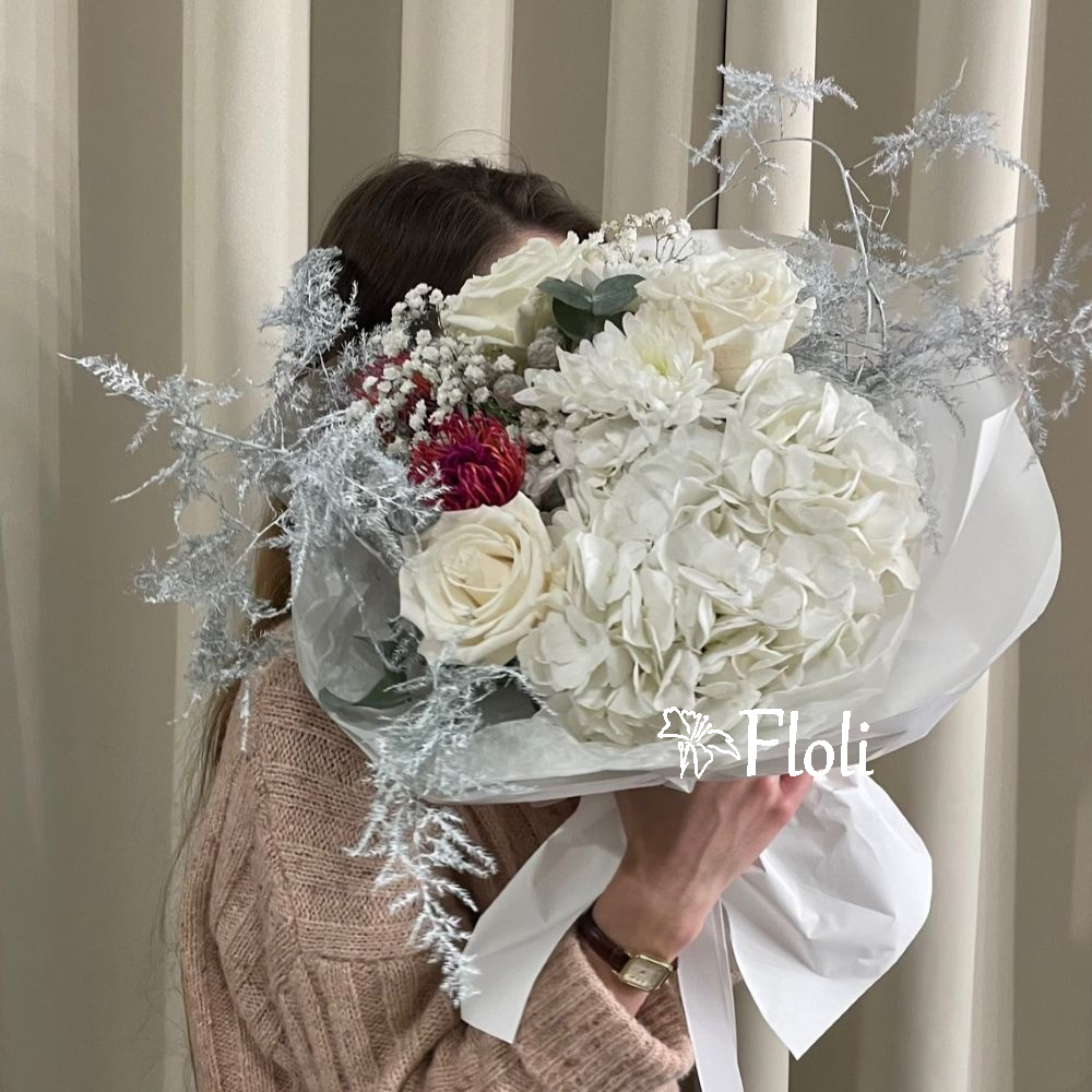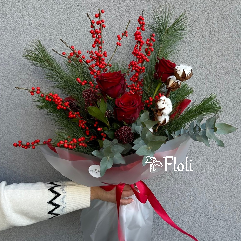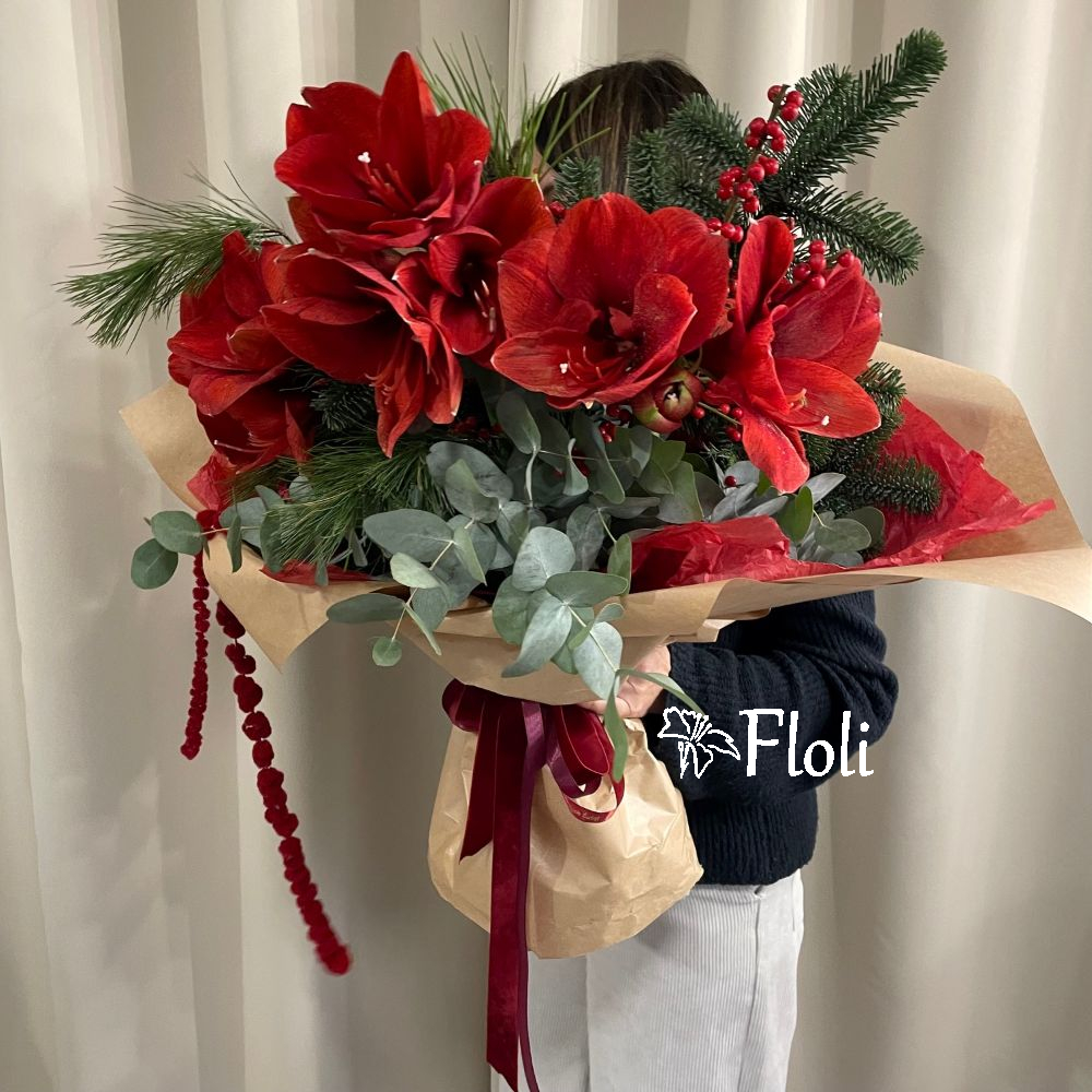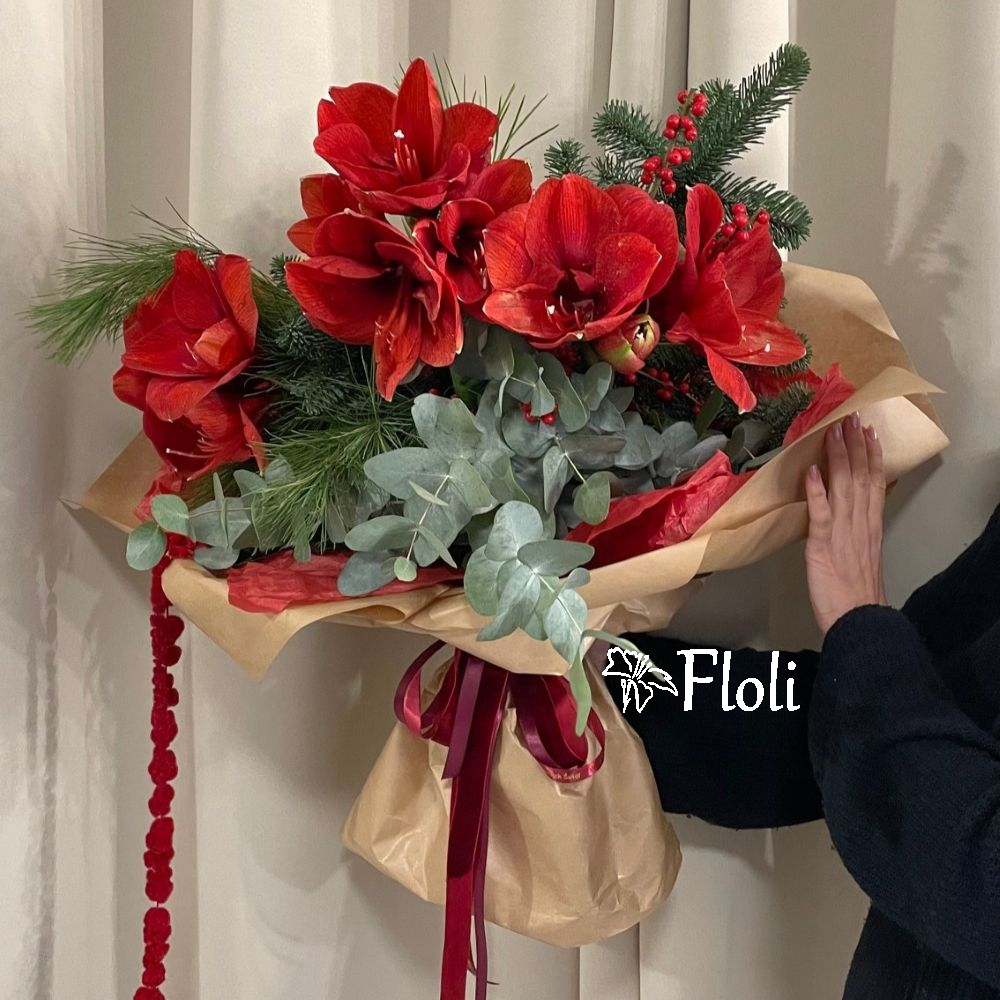 Ten elegancki bukiet łączy w sobie intensywną, głęboką czerwień amarylisa z naturalnym urokiem jodły nobilis, dekoracyjnymi gałązkami ilexu oraz aromatycznym eukaliptusem. To kompozycja, która zachwyca zimowym charakterem, wyrazistością kolorów i piękną strukturą.