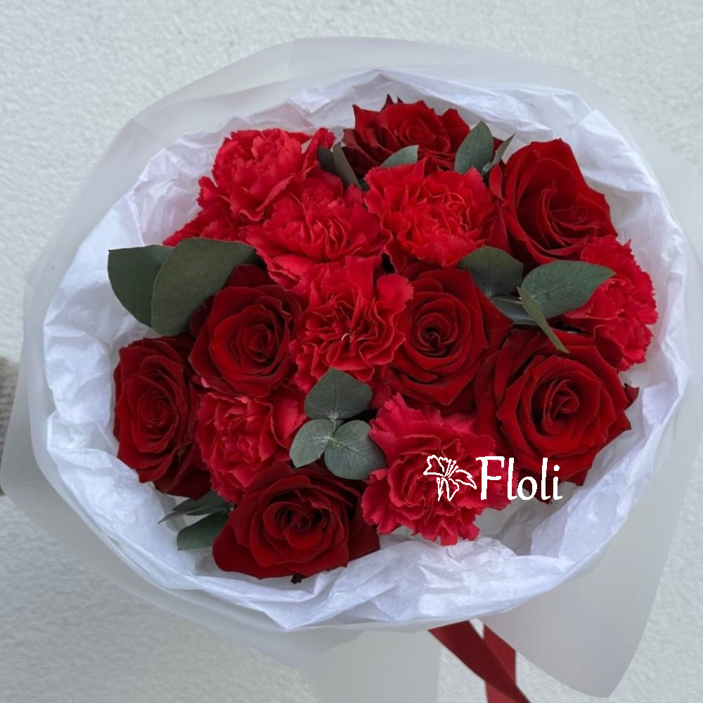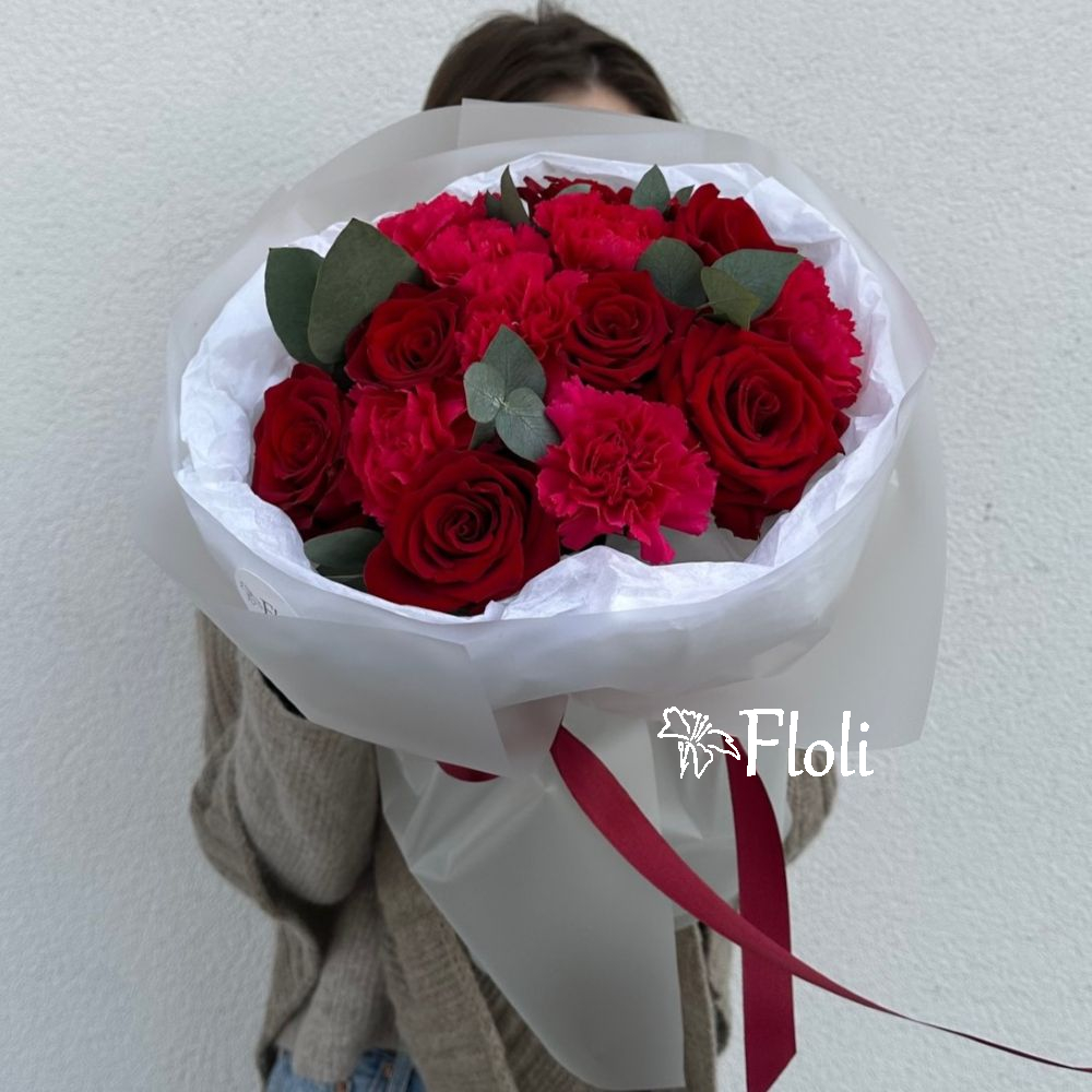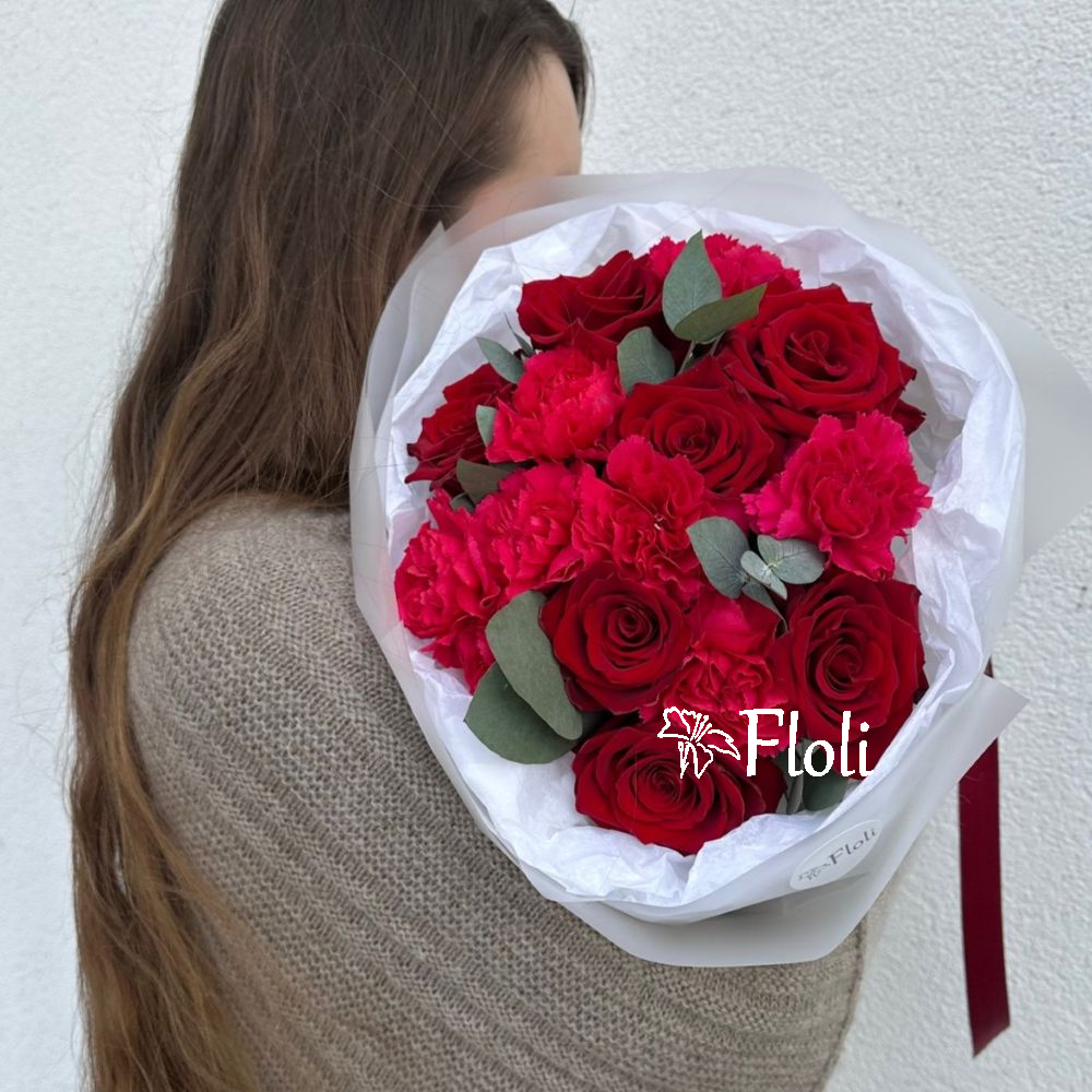 Romantyczny bukiet z czerwonych róż, malinowych goździków i świeżego eukaliptusa. Kompozycja w delikatnym białym opakowaniu, przewiązana czerwoną wstążką. Idealne kwiaty na Walentynki, Dzień Kobiet lub gdy chcesz po prostu wyrazić swoje uczucie i powiedzieć „Kocham”.