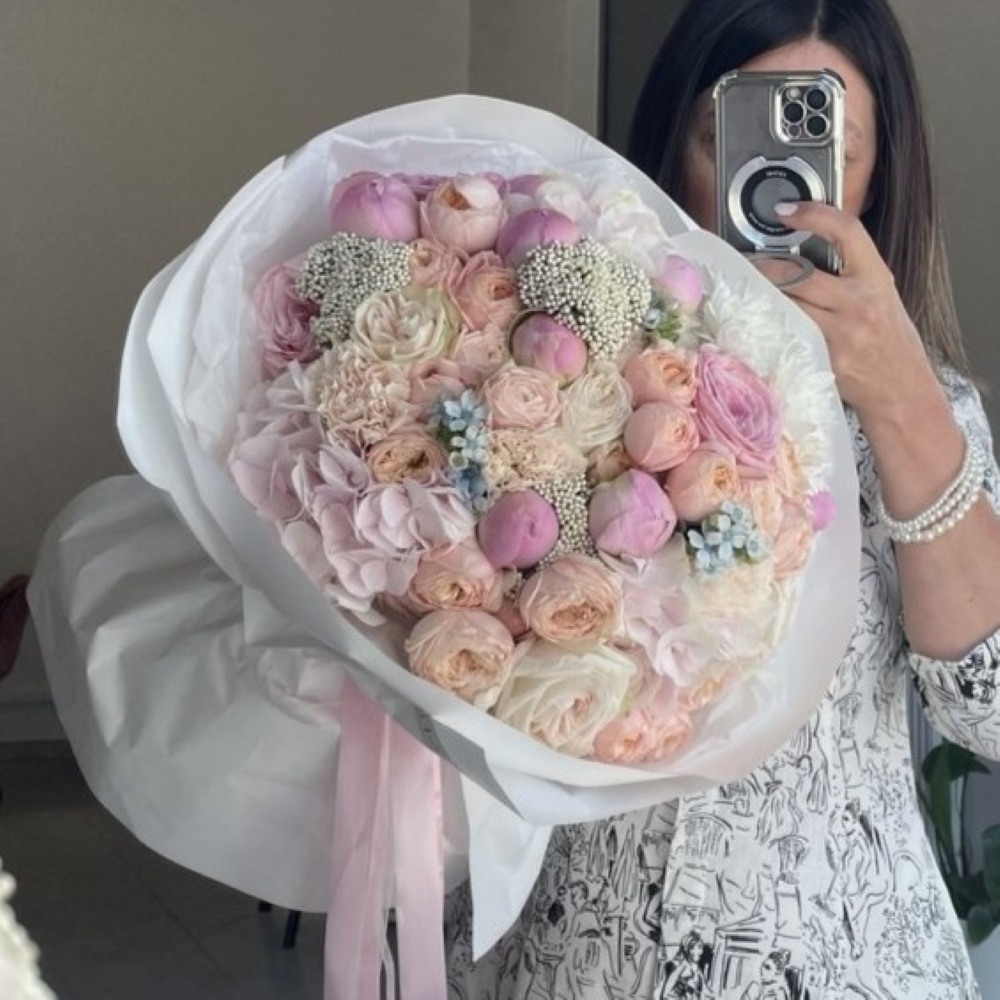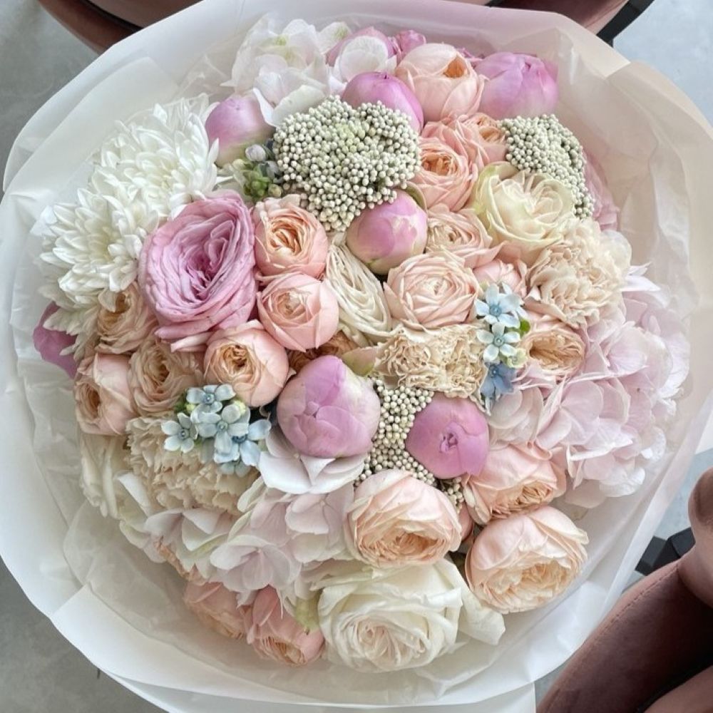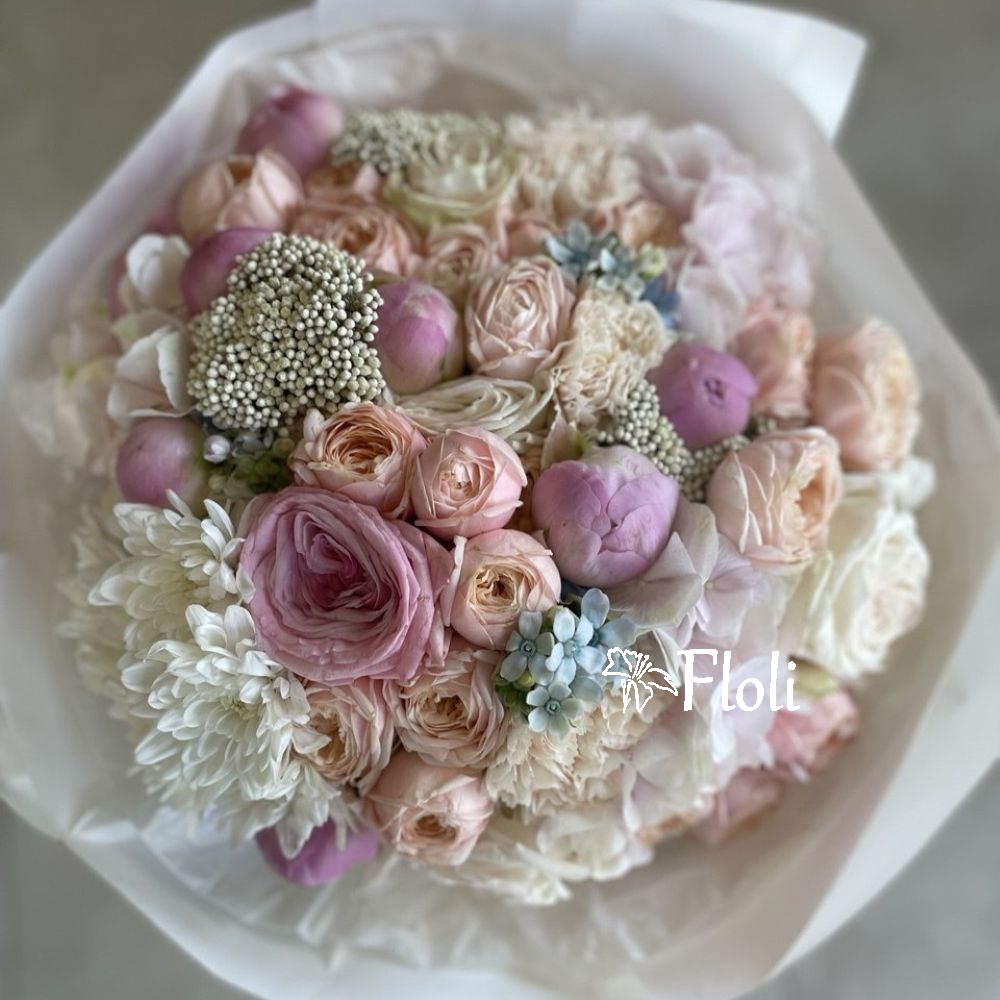 Bukiet Pastel Love to subtelna kompozycja utrzymana w delikatnej, pastelowej kolorystyce. Tworzą go romantyczne róże gałązkowe, elegancka hortensja oraz lekkie, eteryczne akcenty ozothamnusa i oxypetalum. Całość uzupełniają starannie dobrane, sezonowe dodatki, które nadają bukietowi świeżości i naturalnego uroku. To harmonijne połączenie miękkich barw i różnorodnych faktur sprawia, że bukiet jest wyjątkowo elegancki, a jednocześnie pełen lekkości i subtelnego wdzięku.