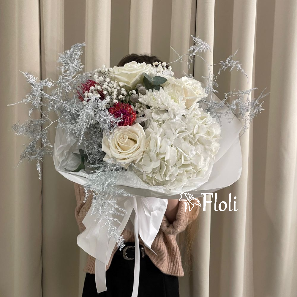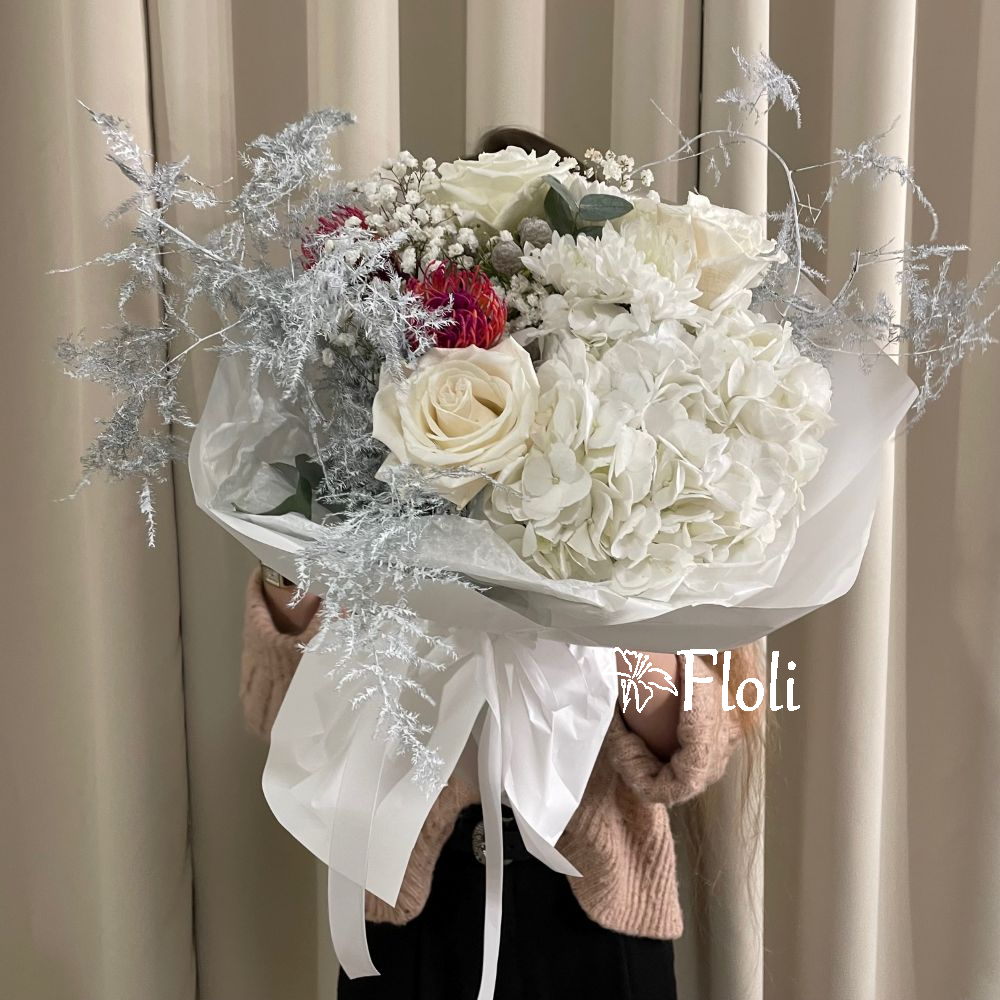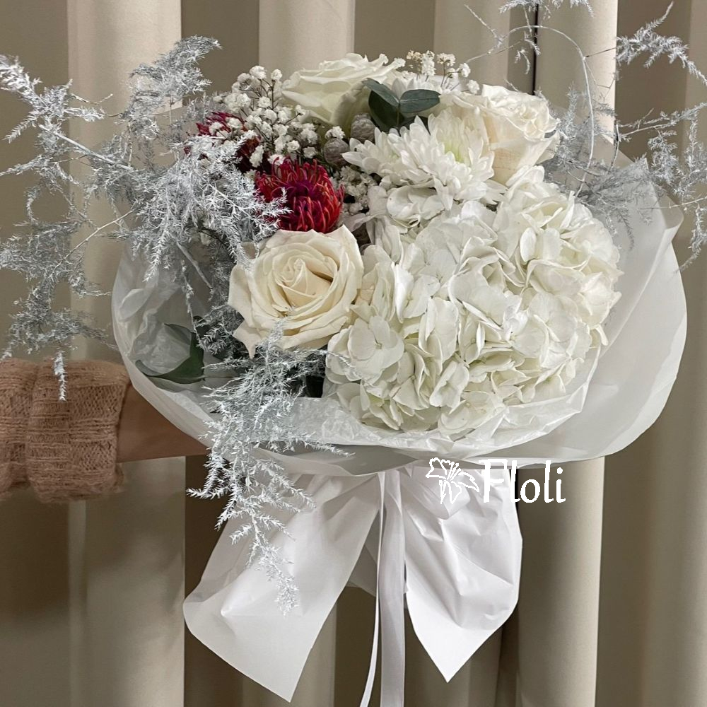Subtelna, zimowa kompozycja utrzymana w czystej, białej kolorystyce z delikatnym akcentem czerwieni. Połączenie obfitej hortensji, klasycznej margarytki, eleganckiej róży oraz lekkiego plumosusa tworzy harmonijny bukiet o mroźnym, świeżym charakterze.