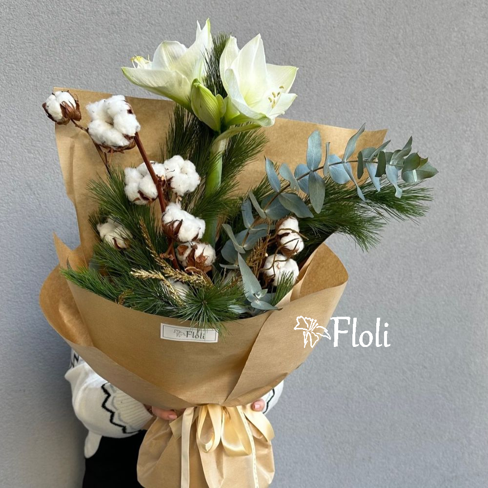 Kompozycja zapakowana jest w subtelne, estetyczne opakowanie i przewiązana elegancką wstążką, dzięki czemu bukiet prezentuje się niezwykle stylowo i jest gotowy do wręczenia od razu po dostawie. To idealny wybór na świąteczny prezent, zimową dekorację domu, biura lub jako wyjątkowy gest bez okazji.