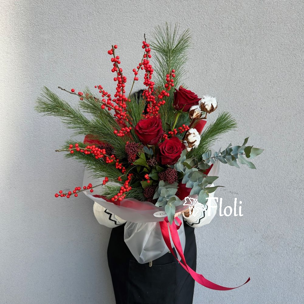 Elegancki zimowy bukiet z czerwonych róż to wyjątkowa kompozycja, która łączy klasyczną elegancję z klimatem świąt i natury. Intensywnie czerwone róże zostały uzupełnione dekoracyjnymi gałązkami ilexu (ostrokrzewu), świeżą sosną, aromatycznym eukaliptusem oraz delikatną, miękką bawełną, tworząc harmonijną i efektowną całość inspirowaną zimowym krajobrazem.