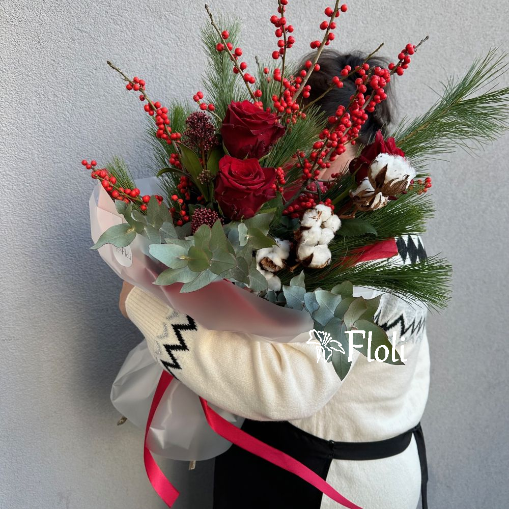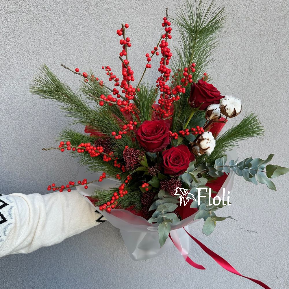 Ten wyjątkowy zimowy bukiet z intensywnie czerwonych róż to połączenie klasyki i naturalnego uroku. Kompozycję uzupełniają dekoracyjne gałązki ilexu, aromatyczny eukaliptus, delikatna bawełna oraz świeża sosna, tworząc harmonijną całość inspirowaną zimowym krajobrazem. Bukiet zapakowany w delikatne, estetyczne opakowanie i przewiązany ozdobną wstążką, dzięki czemu prezentuje się wyjątkowo elegancko i jest gotowy do wręczenia. To idealny wybór jako świąteczny prezent, zimowa dekoracja wnętrza lub wyjątkowy gest bez okazji.