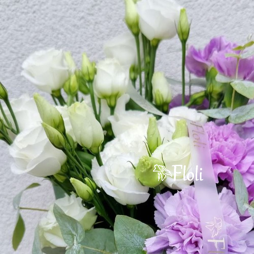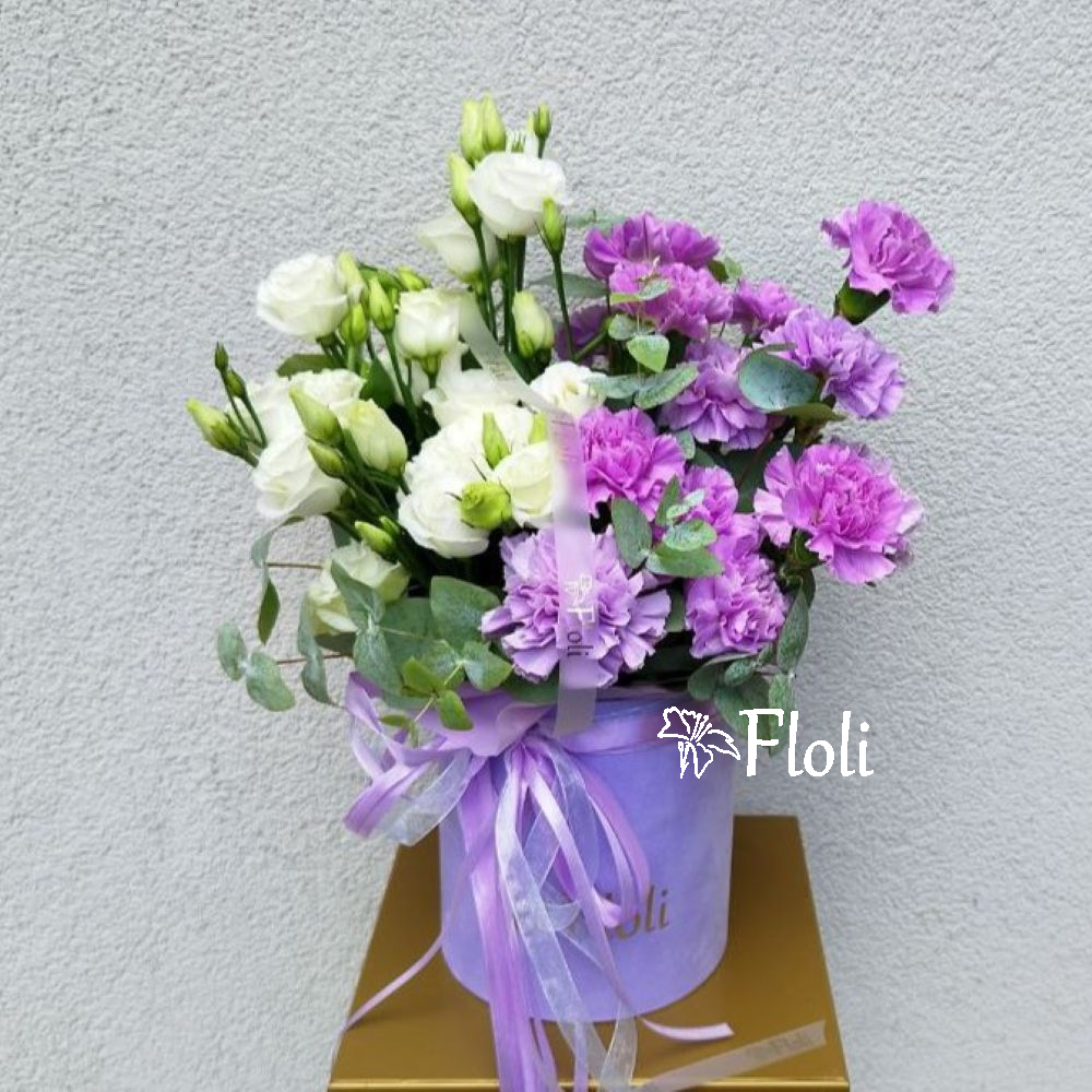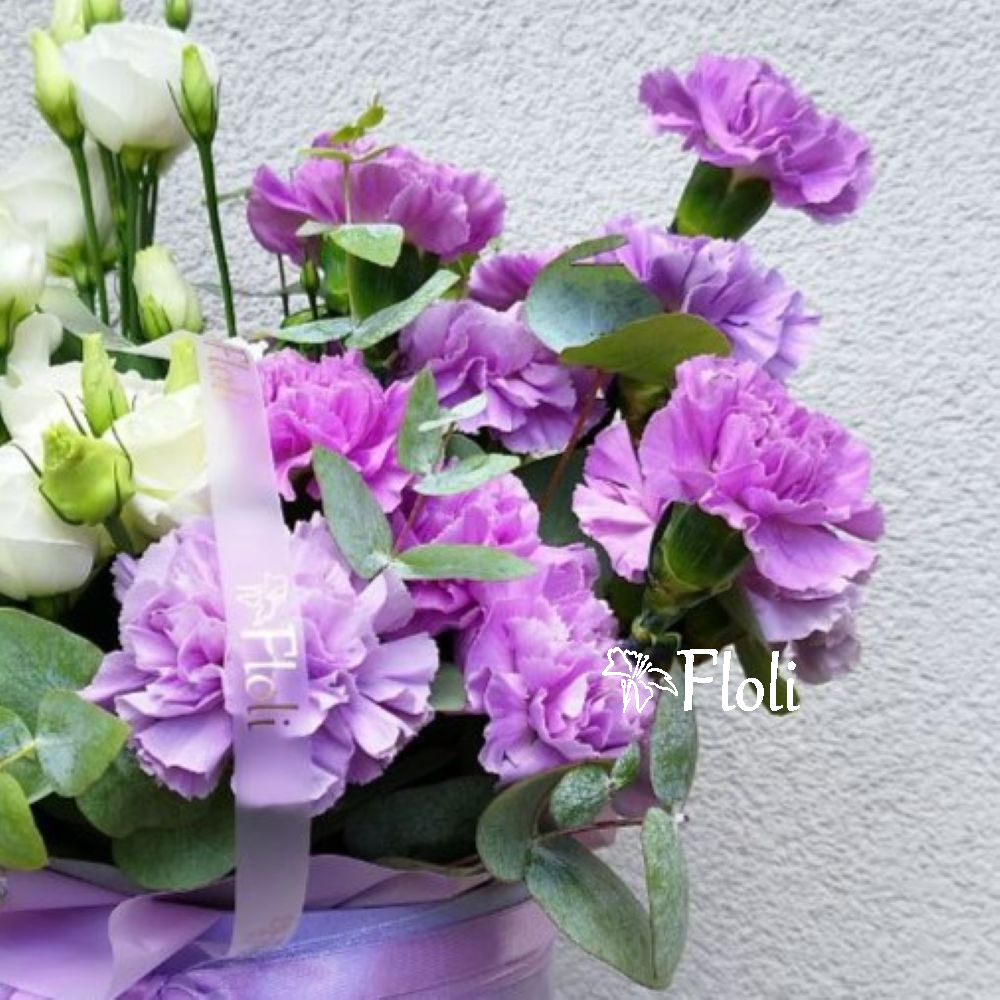 Przepiekne białe i lawendowe kwiaty w delikatnym welurowym pudełku ozdobione eukaliptusem oraz satynowymi wstążkami. Eustoma symbolizuje szlachetność i wdzięczność, natomiast goździk – miłość, podziw i trwałość uczuć. Razem tworzą elegancki duet o subtelnej symbolice.
